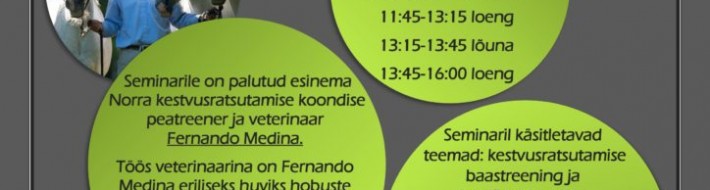☆Info täiendamisel ☆Seminarile on palutud esinema Norra kestvusratsutamise koondise peatreener ja veterinaar Fernando Medina. Töös veterinaarina on Fernando Medina eriliseks huviks hobuste füsioloogia ja geneetika. Tema nõuandeid kasutavad nii araabia hobuste kasvatajad kui ka kestvushobuste treenijad.Seminaril käsitletavad teemad: kestvusratsutamise baastreening ja kvalifitseerumine; kestvusratsutamise treeningud FEI tasemel; treeningplaani ja tulemuste omavaheline seos, hindamine; söötmine; kestvushobuste veterinaarsed […]